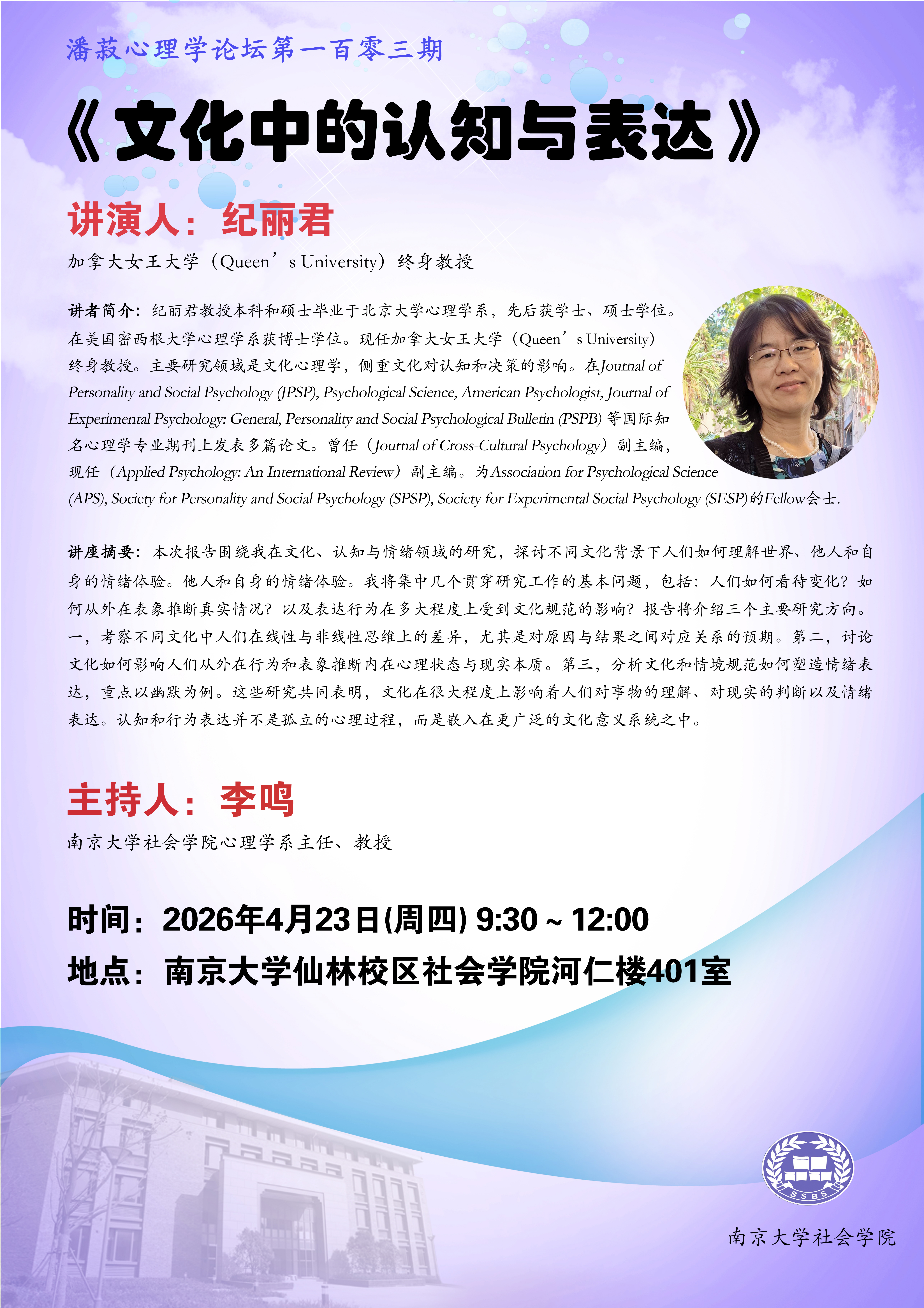讲座 | 潘菽心理学论坛第一百零三期2026.04 -