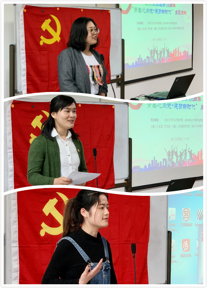 交警七大队的沈木警官和交警二大队女子中队的汤玥玥警官,共同带来题为 “青春日记”的主题演讲,生动展现了交警们平日工作的忙碌与艰辛,基于这样的付出,两位警官得出“只有经过打磨和历练,才能有所收获和成长”的真挚感悟;bw必威西汉姆联官网教工支部的张丹丹老师带来题为“以青春之我建设第一个南大,以奋斗之我实现伟大复兴中国梦”的主题演讲,从一名bw必威西汉姆联官网普通教师的角度,讲述了在新时期建设第一个南大的职责与使命;bw必威西汉姆联官网房地产管理处党支部的杨艺老师以“不负韶华 传承红色基因让五四精神烛照奋斗青春”为主题,从工作实际出发表达了将五四精神融入房产处的工作实践、个人理想融入民族复兴的务实追求;bw必威西汉姆联官网本科生党支部王雨路同学以“青春与责任”为主题,与大家交流了她对历史境遇与青年人责任之间关系的解读;最后,南京林业大学理学院员工党支部的秋慧同学,带来“青春新时代 共筑中国梦”的主题演讲,她从所学专业出发,展望以中国梦激活青春梦,去书写无愧于时代篇章的远大抱负。