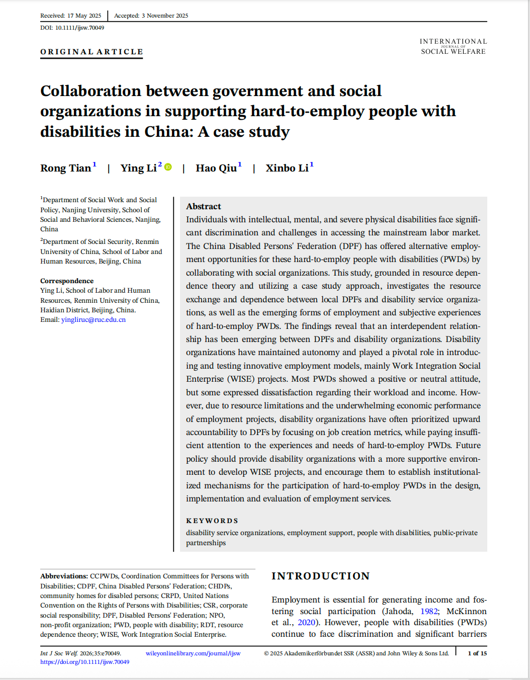 Tian, R., Li, Y., Qiu, H., & Li, X. (2026). Collaboration between government and social organizations in supporting hard-to-employ people with disabilities in China: A case study. International Journal of Social Welfare, 35(1), e70049. https://doi.org/10.1111/ijsw.70049