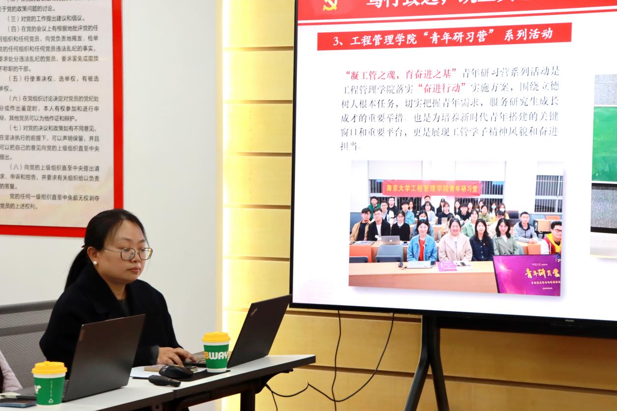 随后,李敏分享了全国高校“百个研究生样板党支部”的建设心得。与会师生共同观看了工程管理学院博士生党支部风采展示视频,李敏重点介绍推动党建与科研目标深度融合的实践路径,包括实施公司党委委员联系支部的标准化机制、支部内部建立严谨的考勤制度、创新运用“党员成长记录卡”进行过程性培养等。李敏特别展示了支部品牌项目“博士生学识论坛”,围绕不同理论学习主题,衍生开展“青年研习营”等系列活动,有效激发了博士生党员在深学细悟中确立科研报国志向的内生动力。