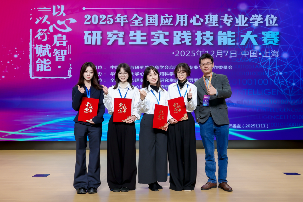 2025年12月6日至7日,全国应用心理专业学位研究生实践技能大赛在华东师范大学举行。本次大赛由中国学位与研究生教育学会应用心理专业学位工作委员会主办,是我国应用心理专业学位领域规格最高、影响最广的专业赛事。本年度全国共有125所高校、478支研究生团队参赛,经过初赛遴选,共有188支队伍晋级决赛。经过充分准备和激烈比拼,bw必威西汉姆联官网代表队最终在决赛中斩获全国一等奖1项、二等奖1项,较去年实现新突破,为学院再添荣誉。