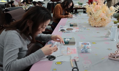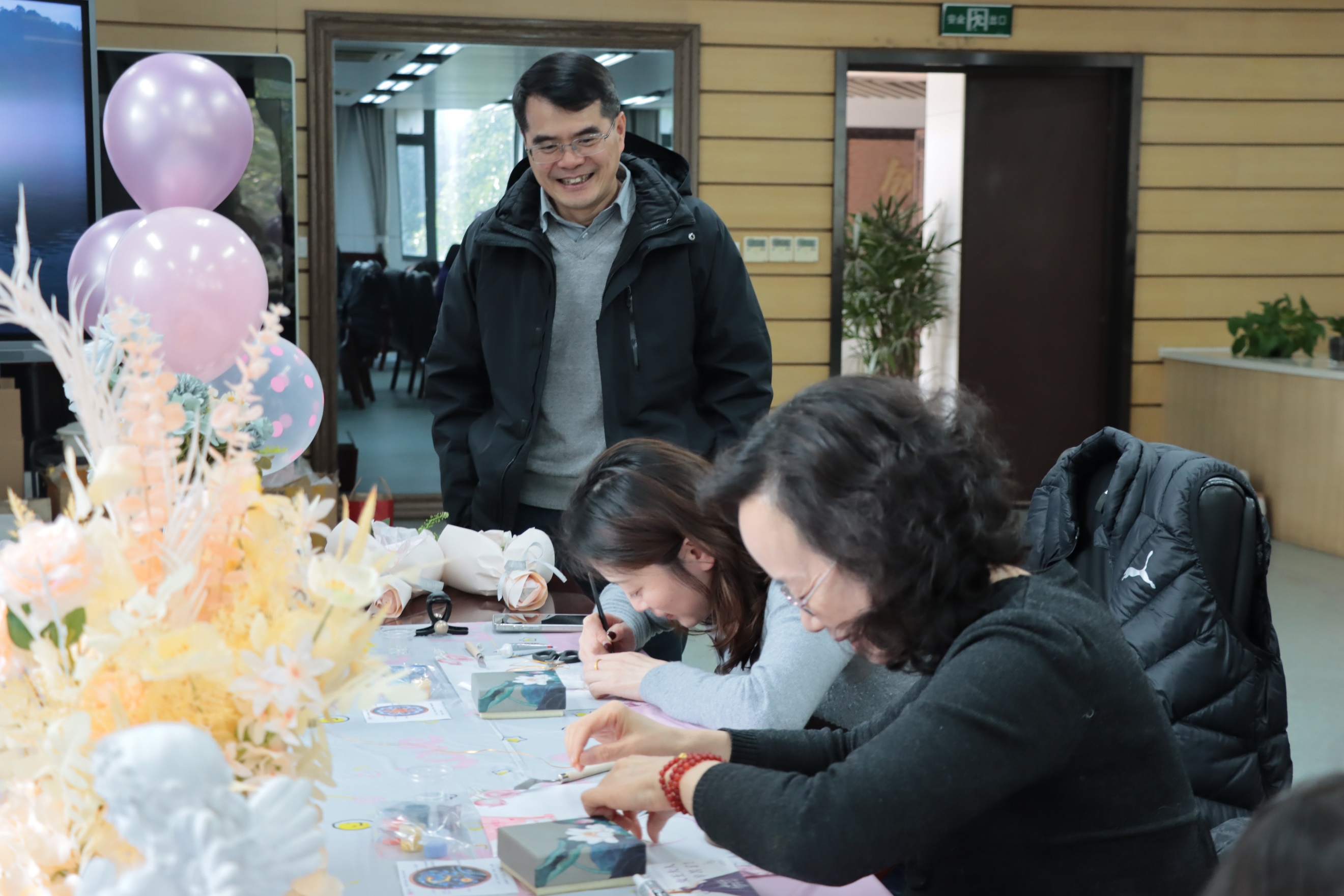 3月7日下午,公司党委书记王建富、党委副书记并经理吴愈晓、副经理郭未、工会主席郭浩等参加了学院女教职工们制作掐丝珐琅杯垫的活动,并为她们送上鲜花和节日祝福。