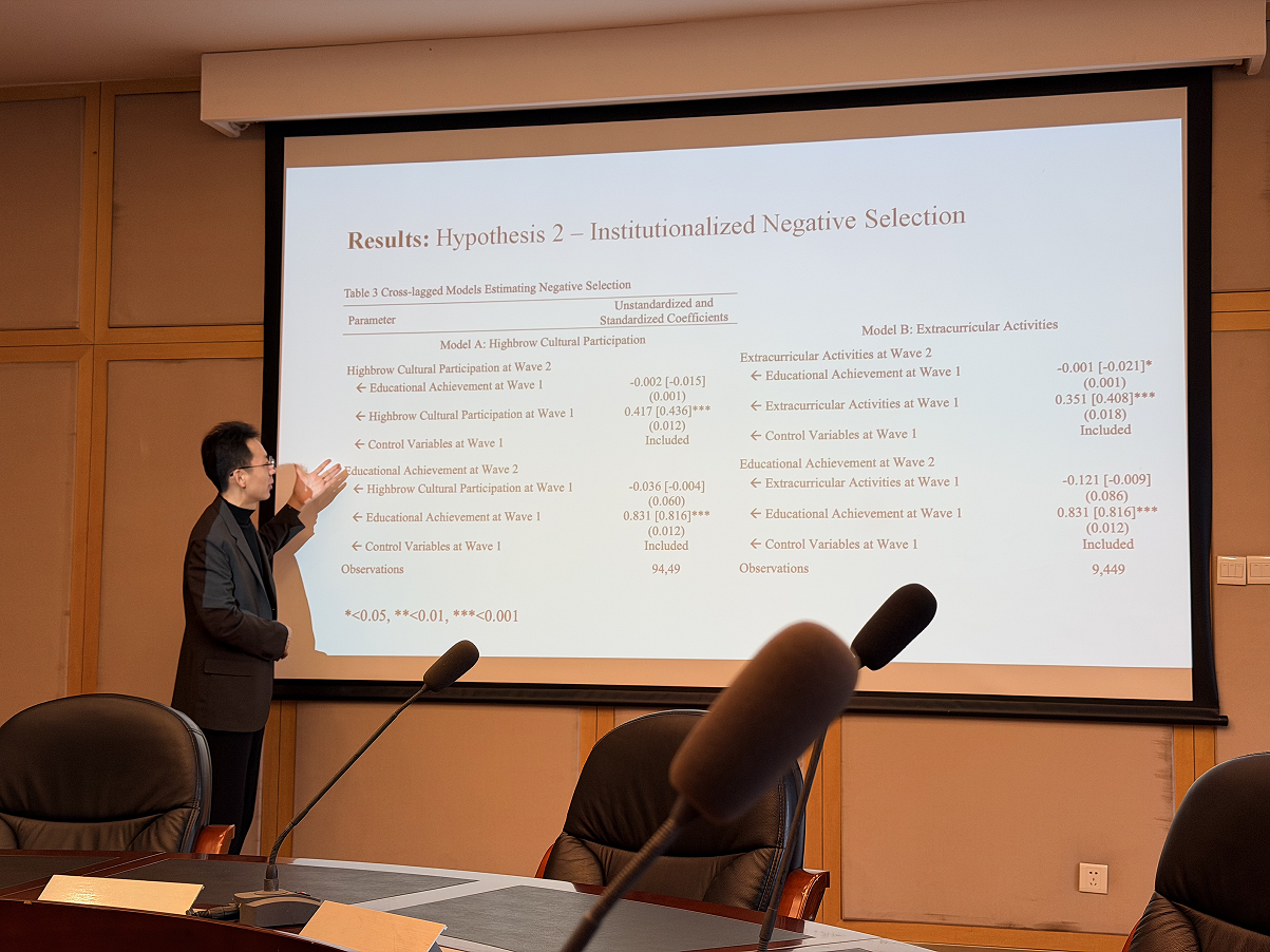 沈文松教授指出,文化资本是社会学核心概念之一,但在中国情境中的作用长期存在争议:与西方多发现其正向效应不同,近年东亚尤其中国的量化研究普遍得到负向结论,形成理论与经验上的双重困惑。他概括既有研究三点不足:一是负效应与东亚教育体制的激烈竞争逻辑不符;二是文化资本通过学习时间、认知与非认知能力、教师优待等路径影响学业的机制验证不足;三是文化再生产与文化流动模型多停留在宏观争论,缺乏立足制度背景的系统检验。由此提出核心问题:文化资本为何在中国呈现“负效应”,其背后的制度逻辑何在?