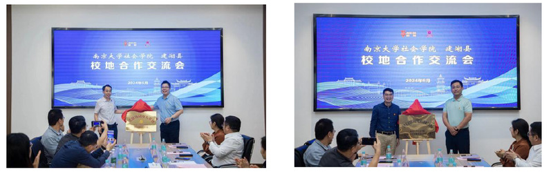 王建富与建湖县委组织部副部长、县委人才办主任孙盘桧共同为“党建协同育人基地”揭牌,吴愈晓和院友企业匠工营国规划设计有限公司常务副总经理石浩玉共同为“员工实习实践基地暨建湖文旅融合实验室”揭牌。校地企三方将以活动联办、资源共享、优势互补为原则,推动党的建设、人才培养、科技创新等方面合作再上新台阶。