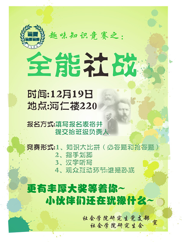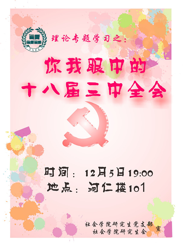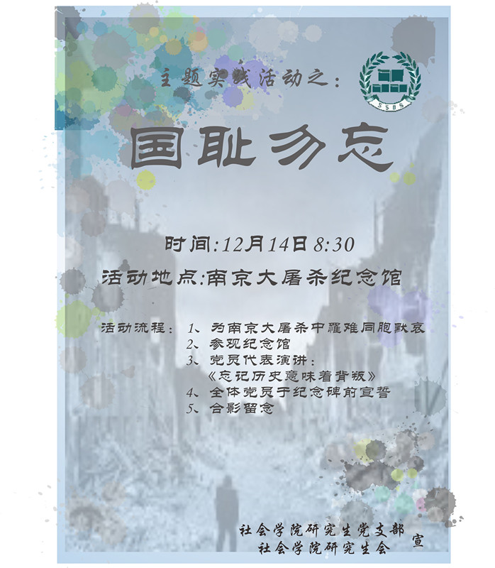 为加强研究生党支部的建设,提高党组织凝聚力,丰富党员的组织生活,公司研究生会和研究生党支部特举办“社彩斑斓•活动月”系列活动。 (1)理论专题研讨:学习•讨论“十八届三中全会精神” (2)主题实践活动:南京!南京!警钟长鸣,国难不忘…… (3)素质拓展活动:趣味知识竞赛 ![]() ![]()