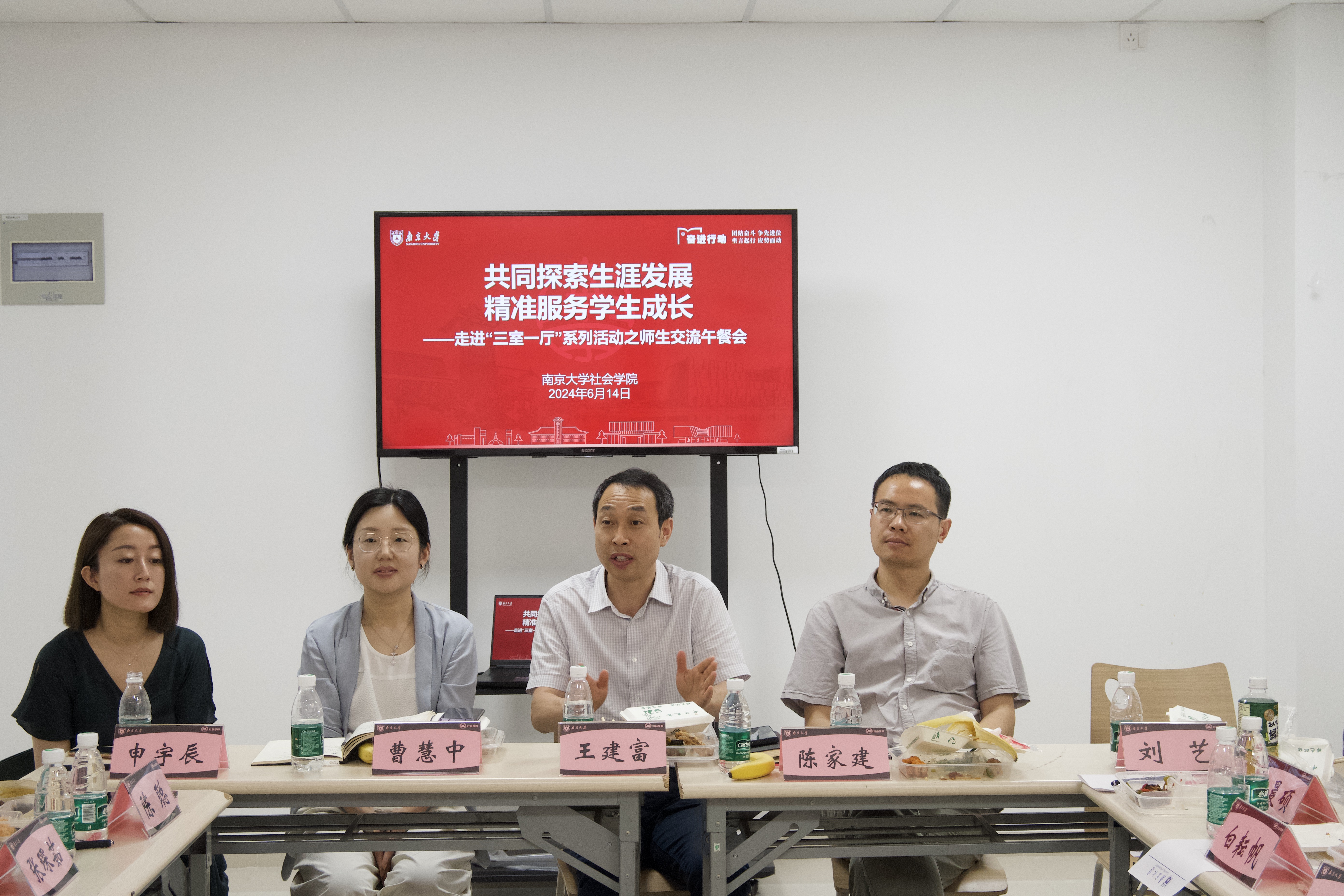 社会公司党委书记王建富,党委副书记曹慧中,本科教学副经理陈家建,心理学系教师、员工就业指导中心生涯咨询师申宇辰,本科生辅导员刘艺与学院2020-2022级本科生代表共进午餐、共议生涯、共话发展。