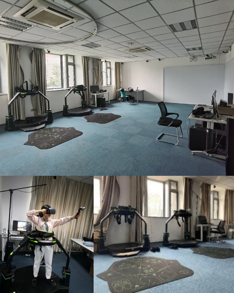 虚拟现实实验室位于204房间。现有虚拟现实系统1套,虚拟现实头盔4套,并配备有投影、发射器、眼镜、音响、手柄、方向盘、方向摇杆以及高性能的计算机工作站等。另外还有虚拟现实全向跑步机2套,体感器2套,可以满足多种实验需求。