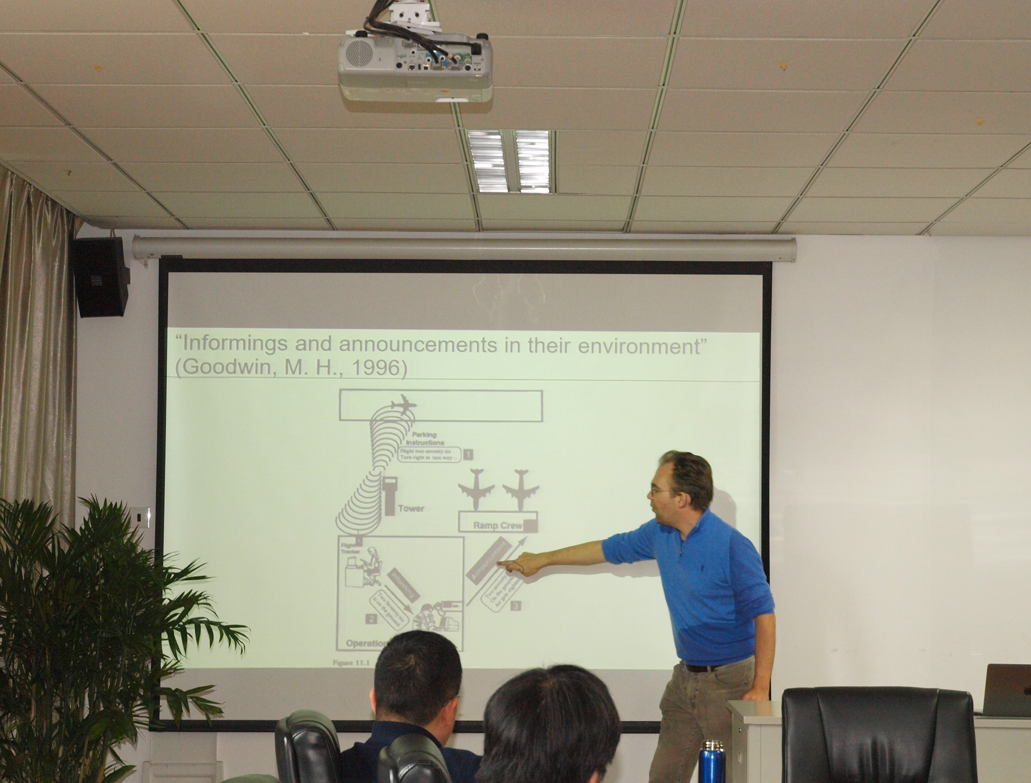 在此基础上,Christian教授重点通过“I hide You”的例子说明他的研究旨趣。他指出,人们的日常生活中的沟通和社会行动具有“索引性”,并且人们在不同场合不断修缮(repair)自己的言行,可见,言语在互动中起到了多么重要的作用。基于加芬克尔(Harold Garfinkel)的常人方法论(ethnomethodology)和对话分析(conversation analysis),Christian教授设计了一个相对理想的室内-街头拍摄互动实验(video analysis and workplace studies),目的是观察互动中的人们如何通过语言解决问题(spotting and dealing with trouble)。整个实验分为室内(control room)与室外(undergrounds and ground operations in an airport),至少七名人员参与完成实验,三位室外操作者(runner/performer)、三位控制室内观控者(director/stage manager)、一位总控制人员(monitor,唯一能对三位室外操作者通话的人),参与实验的志愿者皆经过训练,共同演绎(rehearsal)实验。实验类似“捉迷藏”,三位室外操作者一边摄像一边在不同的街区走动,各自躲避进入其他操作者的拍摄范围内,一旦发现拍到了其他室外操作者则立即按下快门,手捧摄像机、身配耳麦,携带手机,远程将画面和与声音实时传送至观测室的电脑(3台),观测室三位观控者分别观测三位室外操作者的拍摄,本着确保实验完整有序进行的目的给予室外操作者远程提示(reminder)或指令(announcement),例如“乔丹妮的麦克风掉了”、“你可以蹲下来一点”、“天黑了,你(的录像)开始出现马赛克了,你可以慢一点”、“你没有按下快门”、“你可以蹲一点吗”等讯息,室外操作者依据耳机的提示做出反应(或蹲下,或慢性,或躲避,或走进人群等),循环往复。这个过程主要用于探究自我与他人的互动(比如要求“more faces”,操作者均走入人群,却没有把摄像头反转对着自己)和话语的时效性,能够展现出这样的互动“潜规则”:不同场域人们通过不同的话语(对指令性话语多用于要求客体立即调整行为,建议性或鼓励性的话语多用于对客体未来行为的调整或者委婉建议)进行互动(build conversations)。这个实验的创新在于通过影像研究画面之外的互动,对于微观社会学的研究是一个新的尝试。