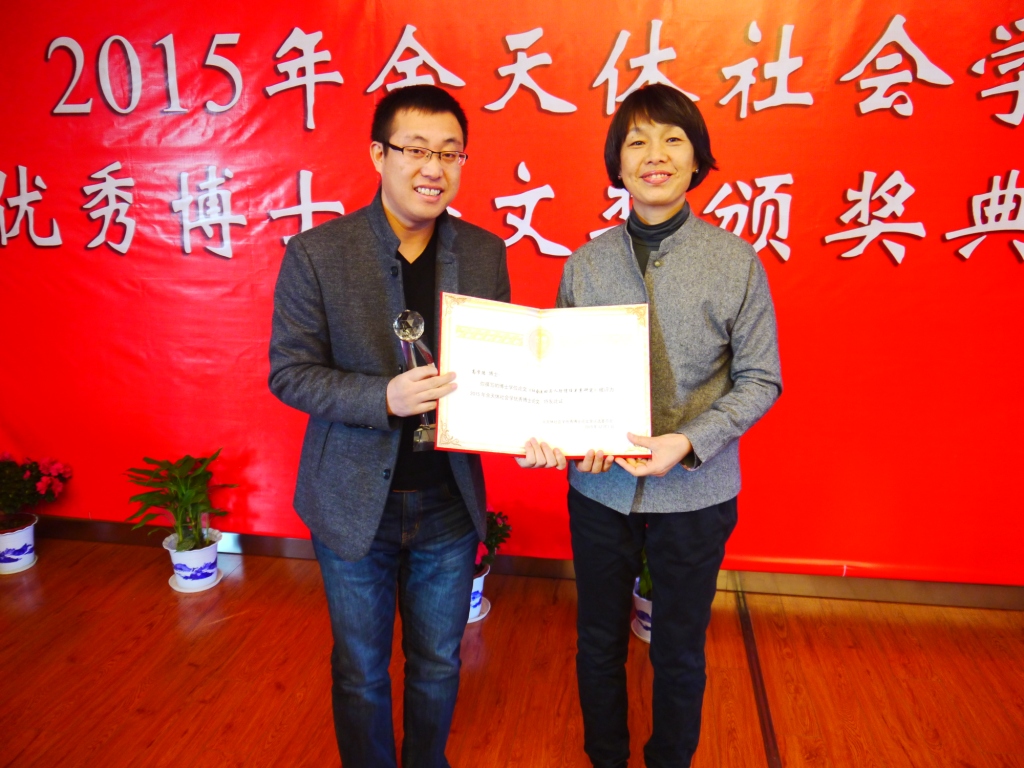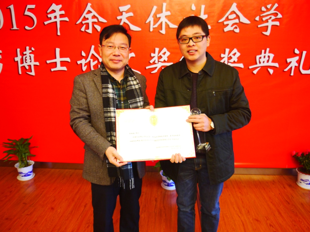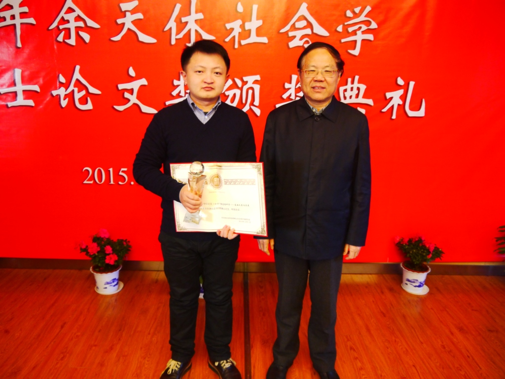 宋林飞教授又为北京大学社会学系的陈涛博士颁发了证书和奖杯。陈涛博士说,能够获得这个奖项既是对他本人的肯定,也是对社会学领域内做理论研究的肯定,他感到由衷的高兴。陈涛博士介绍了自己的选题来源,他认为不同的研究其背后都会有共同关心的问题,涂尔干《自杀论》中的统计分析、《社会分工论》中提出的类型分析以及其宗教研究的人类学取向,其实都关注到共同的、基本的问题,回到经典理论的意义就在于,让我们看到不同的研究取向曾经所共有的研究问题是什么,这个问题这就是他论文的主题对于“道德科学”的探讨。涂尔干的根本设想是一旦可以把握道德的起源和变迁就可以取代传统的哲学和伦理学、基于人性去推演道德的方式。但是,今天某种程度上社会学已经忽视了这门学科最初所关注的问题——对于道德和政治现象的思考。他希望通过学科史的研究将社会学和之前的道德科学以及政治哲学关联起来,挖掘它们背后的问题。最后,陈涛博士感谢了自己的母校北京大学,感谢导师谢立中教授,他说在北大遇到了许多在治学和为人上都能作为自己榜样的老师,给了他宽松的学术研究环境,帮助他能够将“无用”研究很顺畅地展开。