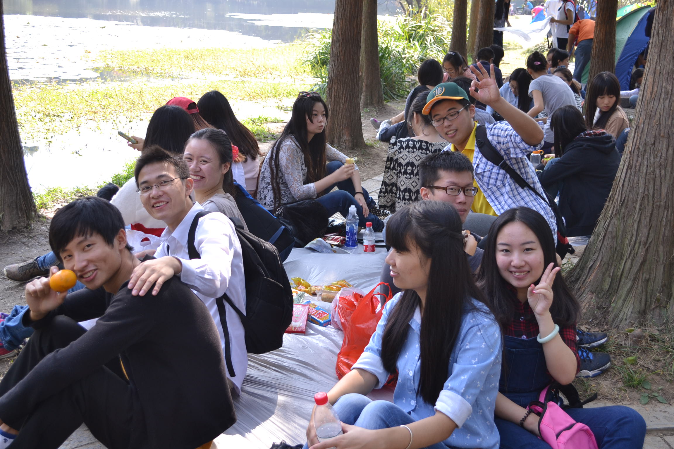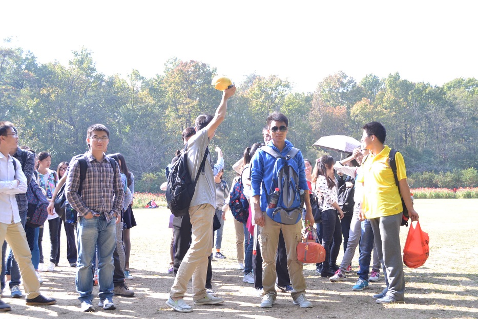 在经过近半个小时步行后,同学们来到了紫金山下的“流徽榭”,第二阶段的活动项目将在这里展开。由于邻近中午同学们纷纷掏出自己带的各种水果、饼干、小零食来当午餐,来自不同高校的同学们互相分享着彼此的食物,嬉笑打闹、其乐融融。在经过午餐交流后,同学们采用简单版“非诚勿扰”的模式自由选择队友,各队伍摩拳擦掌准备进入第三阶段——“攀爬紫金山”。