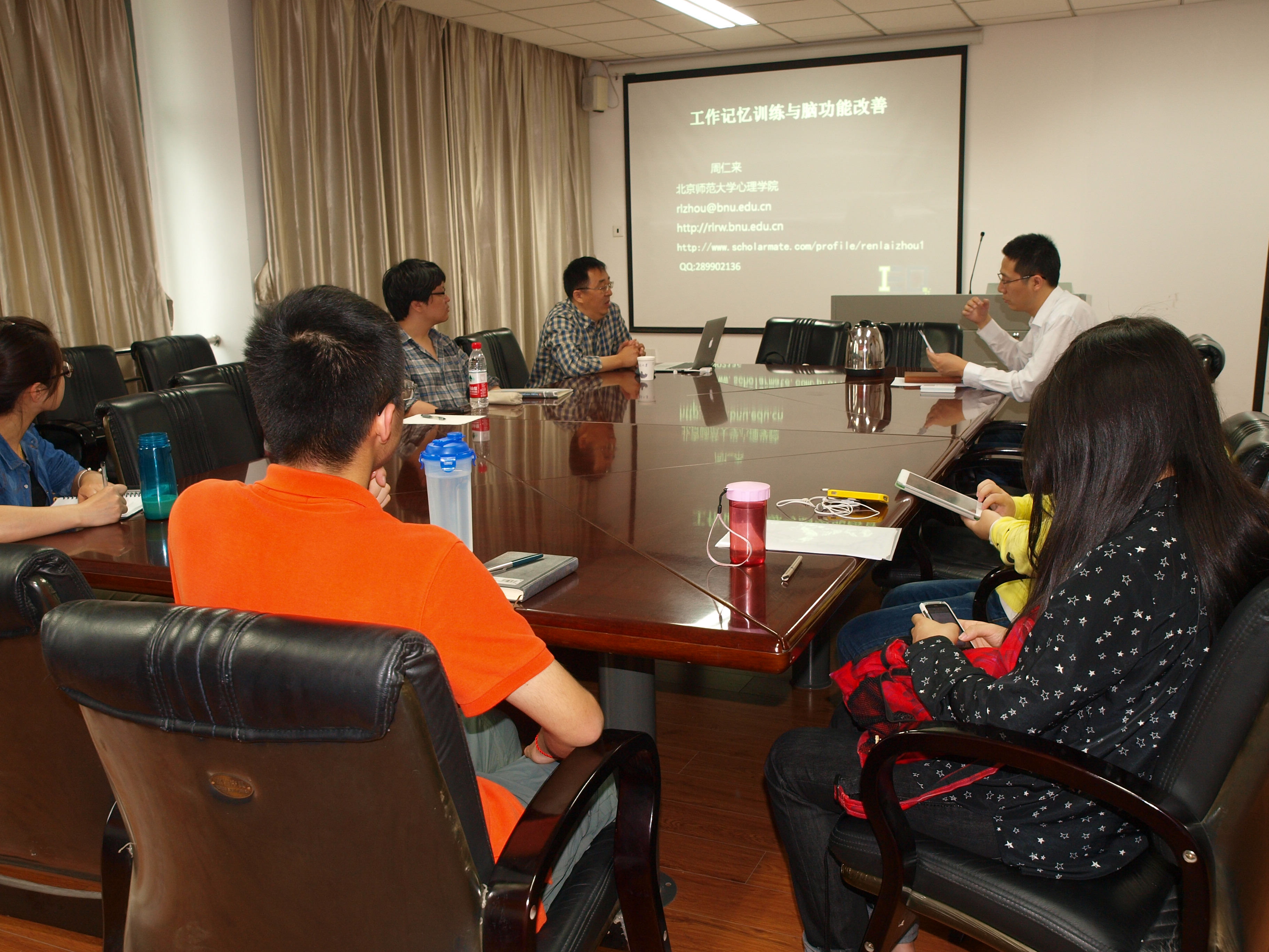 2014年5月19日下午,北京师范大学心理学院周仁来教授在公司河仁楼开展了题为“工作记忆训练与脑认知功能改善”的学术讲座,讲座吸引了心理系师生的热情参与。讲座由心理系副主任李中权副教授主持。