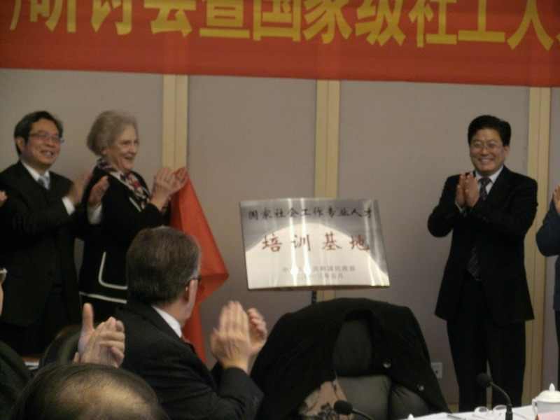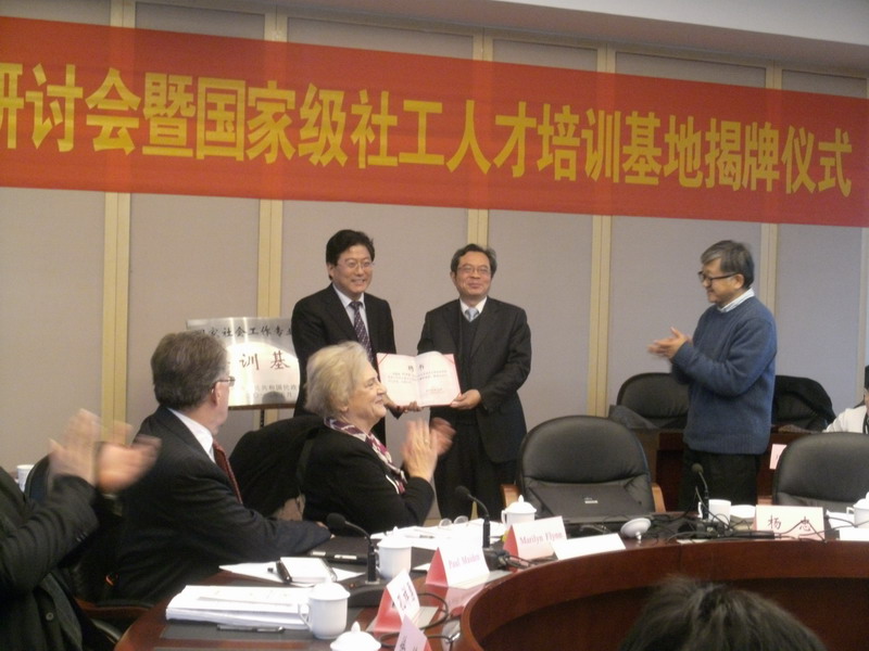接下来是由杨忠副董事长、戚锡生副厅长和Marilyn Flynn经理一起进行了“国家社会工作人才培训基地”的授牌仪式和由杨忠副董事长颁发了新聘MSW中心兼职教授证书,以及MSW中心新聘教授戚锡生以及以往聘任的兼职教授爱德基金会邱秘书长发表讲话。之后是bw必威西汉姆联官网和南加州大学相互赠送礼物以及全体与会人员在bw必威西汉姆联官网楼前合影留念。