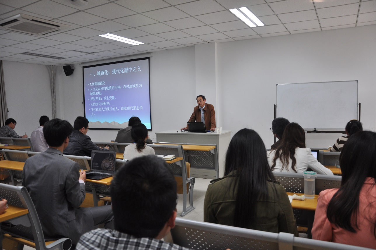 城镇化与现代化相伴而生,而中国的城镇化与西方相比有其共性,也有其差异。邹教授详细讲述了现代社会的基本特征,包括产业结构、人口结构、社会结构、城乡结构等,分析了城镇化的“质”、“量”问题。通过对比国际城镇化的发生和发展过程,剖析了中国城镇化面临的诸多问题,认为与我国的制度设计有关。邹教授认为,城镇化不只是几个指标的问题,核心是人的城镇化,关系到人的价值观和生活方式的改变。中国需要反思和解决公共产品的均等化问题,还有社会保障制度的完善。邹教授的深入浅出的演讲让同学们对“城镇化”这个看来很熟悉的社会学课题有了更深入更细致的了解,其提出的观点也颇具启发。讲座过后,同学们也提出问题与邹教授交流。