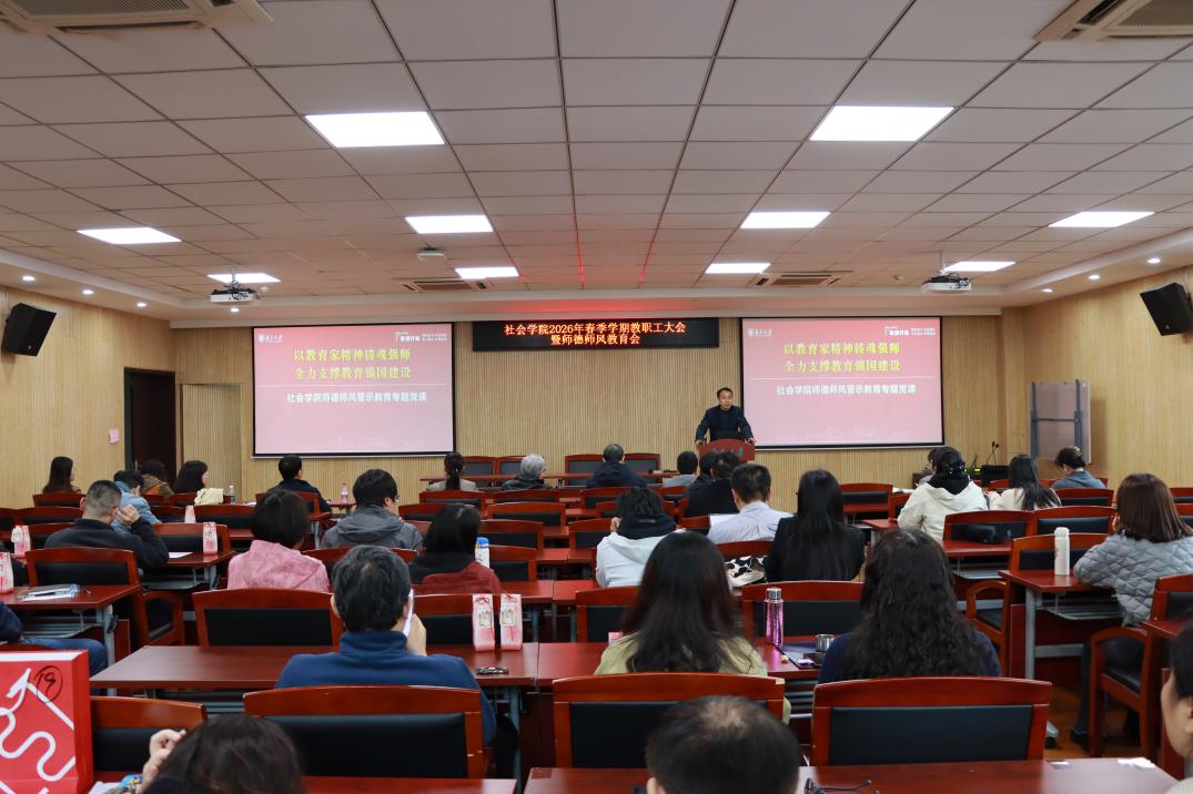经理吴愈晓对学院春季学期工作任务进行布置。他强调,2026年是“十五五”开局之年,是教育强国建设三年行动计划承上启下的关键节点,也是学院深化“双一流”建设、实现高质量发展的攻坚之年,学院将紧密结合“十五五”良好开局与“治理能力持续提升年”的总体要求,以“奋进行动2.0”为牵引,以更高站位、更宽视野、更实举措,推动学院事业高质量发展迈上新台阶。